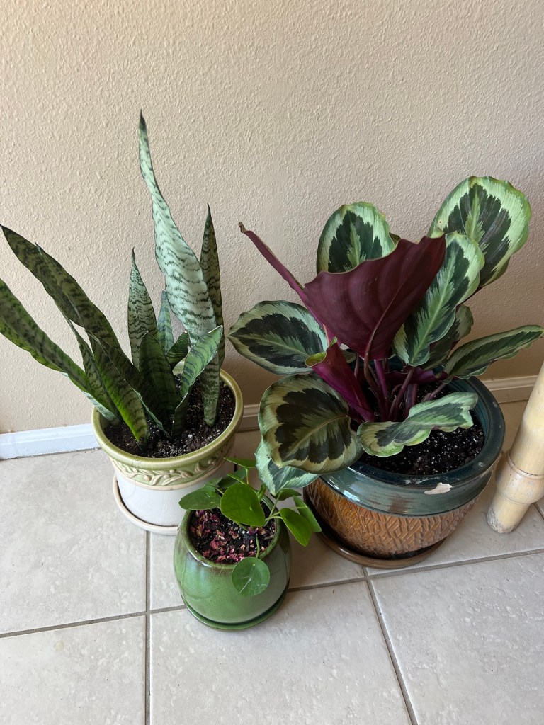 I was also looking for a snake plant (tall one on the left) because they’re notoriously hard to kill, and I’m still a beginner-to-moderate skilled plant owner. It’s been on my bucket list of plants for a while. I really love the pot it’s in, it’s very pretty.