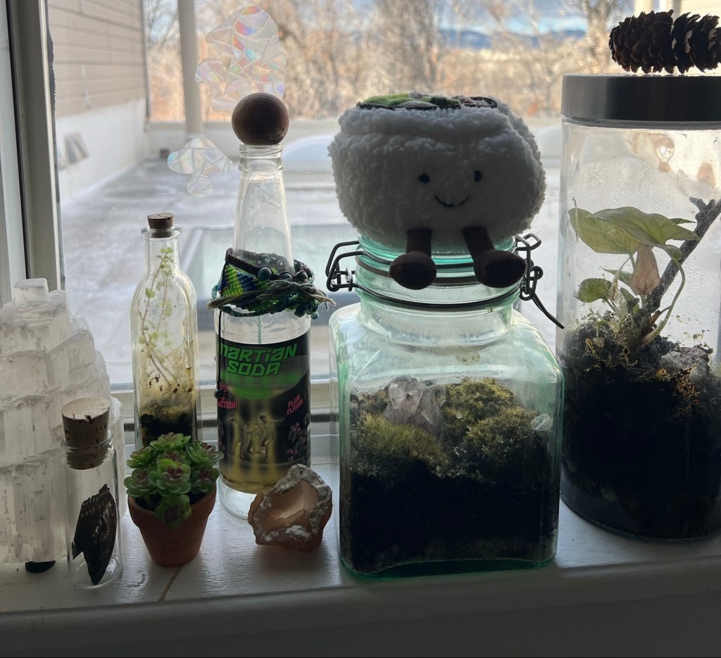 Next is my Jellycat plushies… my favorites! They’re very well made and super cute. My California sushi roll is sitting on a terrarium.