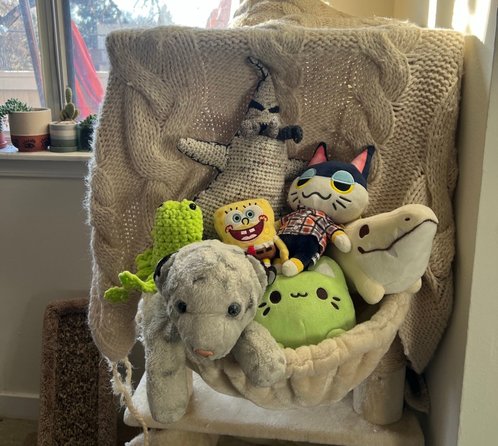 I put some in this basket that Stuffing is too big to use on his cat tree! It is home to a crochet frog, crochet Oogie Boogie, mini SpongeBob, Punchy from Animal Crossing, green cat I named Mochi, and a small Croconana. Then there’s the most important plushie I have- Tiger, a very old white tiger I got when I was a baby.