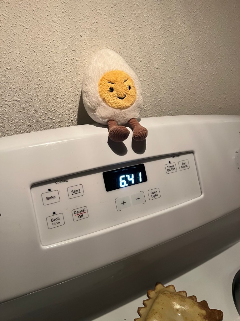 The egg is super cute and I have him sitting on top of the oven to help me cook.
