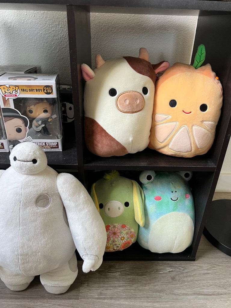 Next is my squishmallows. I take the tags off so I don’t remember their official names except for the cow is named Ronnie. I won the orange at Elitch Gardens amusement park in Denver when I was 16. The donkey was a gift from my friend Sara, and the frog was a gift from my mom. There’s also a Baymax plush from Big Hero 6, my favorite movie.