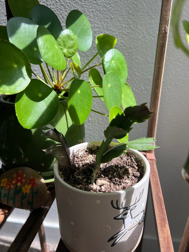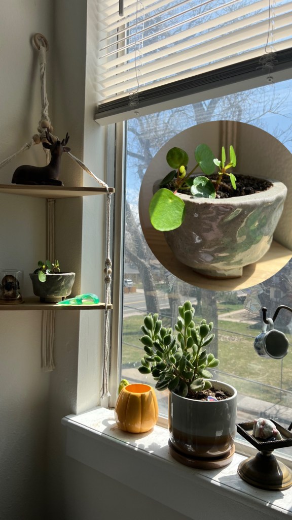 Here’s another shelf, where I moved my Christmas cactus! Now it’s roommates with my Chinese money plant.