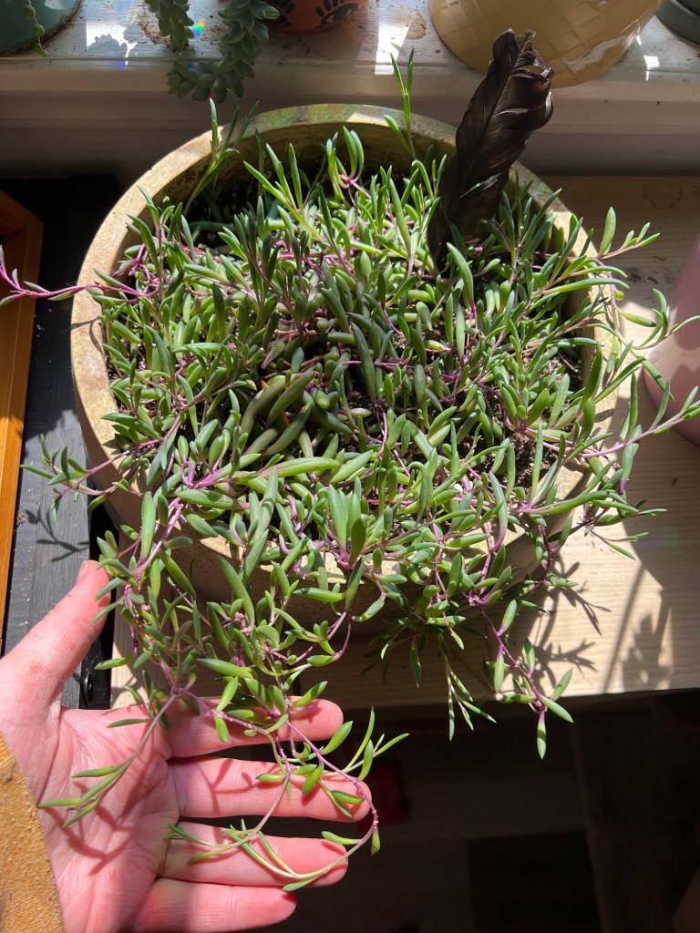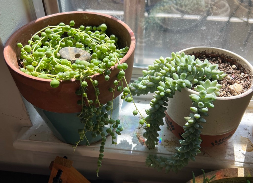 Janis, the string of pearls, got really long so I looped her around in the pot a couple more times. My burros tail is getting really long!