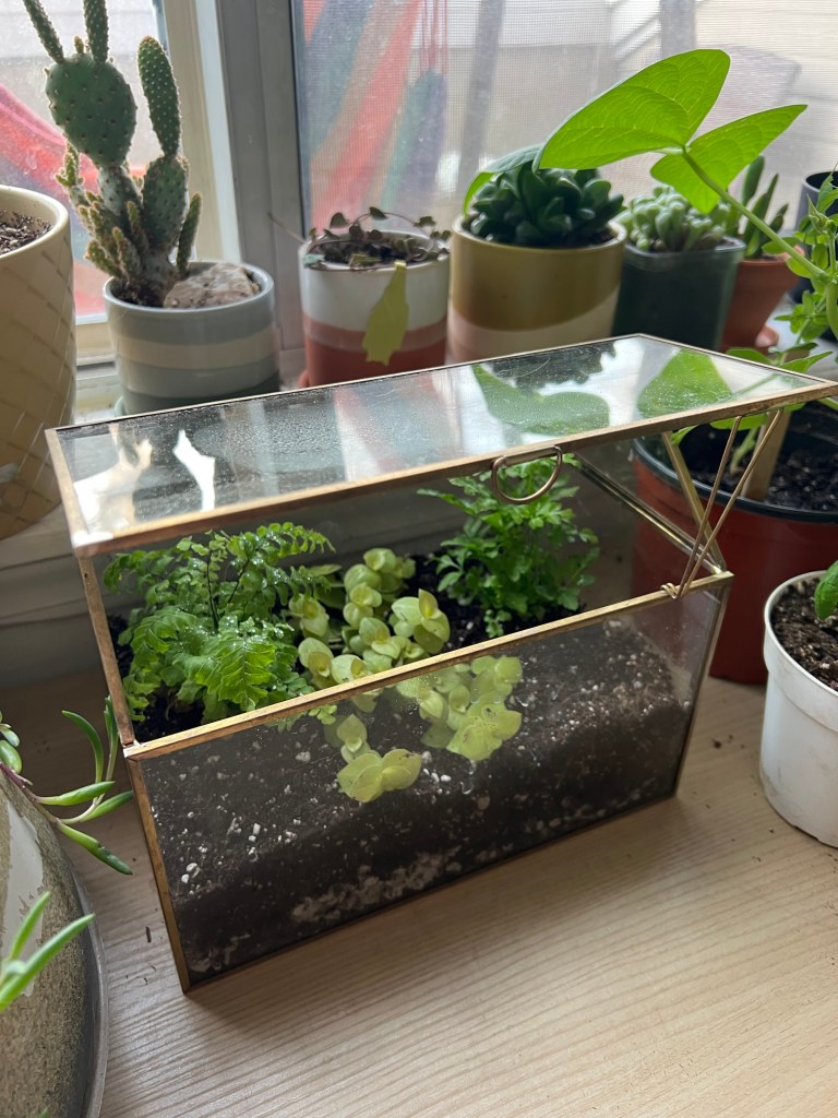 Last but not least, my oldest plant- my terrarium “Love Persisting”- is still growing! It’s next to the moss terrarium. It’s been 2 years since I got it as a gift and started my plant obsession.